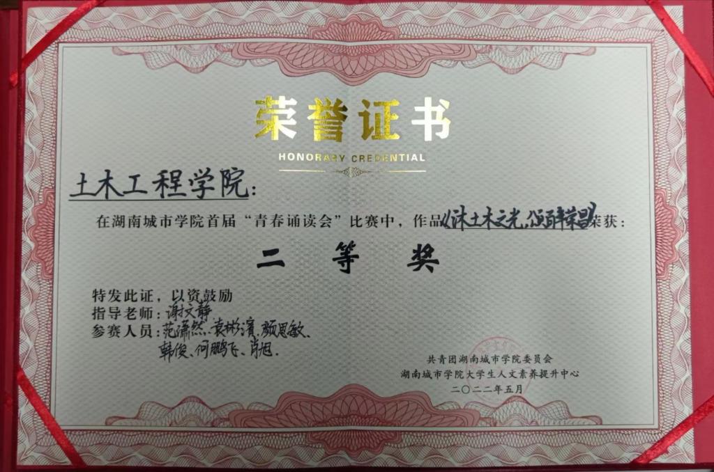 经过激烈的角逐,我院荣获大赛二等奖以及最佳组织奖。我院将以此为契机,抓好专业知识教育的同时持续扎实开展语言文字工作,传承中华经典、弘扬时代精神、牢记根本使命、抒发家国情怀,为立德树人、培根铸魂打下坚实的基础,培育出一代代堪当时代大任的土木青年!
