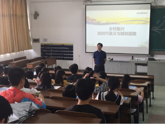 2019年5月31日,院党委书记郭白泉在1-207为大一新生1801401、402、403、501、502班同学主讲题为《乡村振兴的时代意义与规划蓝图》的形势政策课。