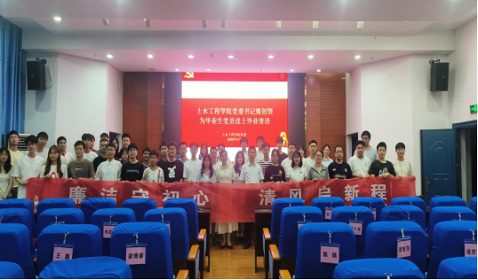 最后,谭勇平带领全体党员同志践行廉洁承诺。全体毕业生党员纷纷走上台前,在廉洁从业横幅上郑重签名。