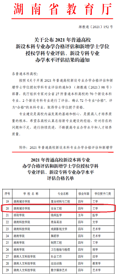 近日,湖南省教育厅发布了《关于公布2021年普通高校新设本科专业办学合格评估和新增学士学位授权学科专业评估、新设专科专业办学水平评估结果的通知》(湘教通[2021]152号),我院安全工程新设本科专业经专家评审、省教育厅严格审查,顺利通过评估,获得学士学位授予资格。