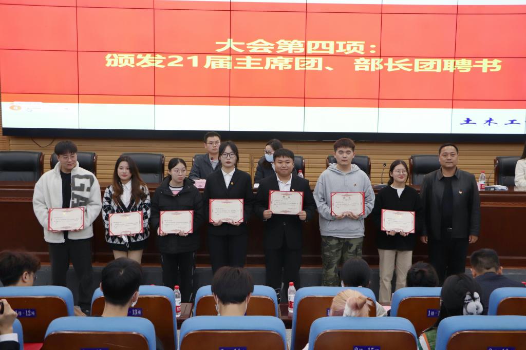 大会为21届主席团、部长团成员颁发了聘书,宣读了22届团学会组织架构及各部门组成成员名单,简要介绍了22届团学会主席团成员概括。