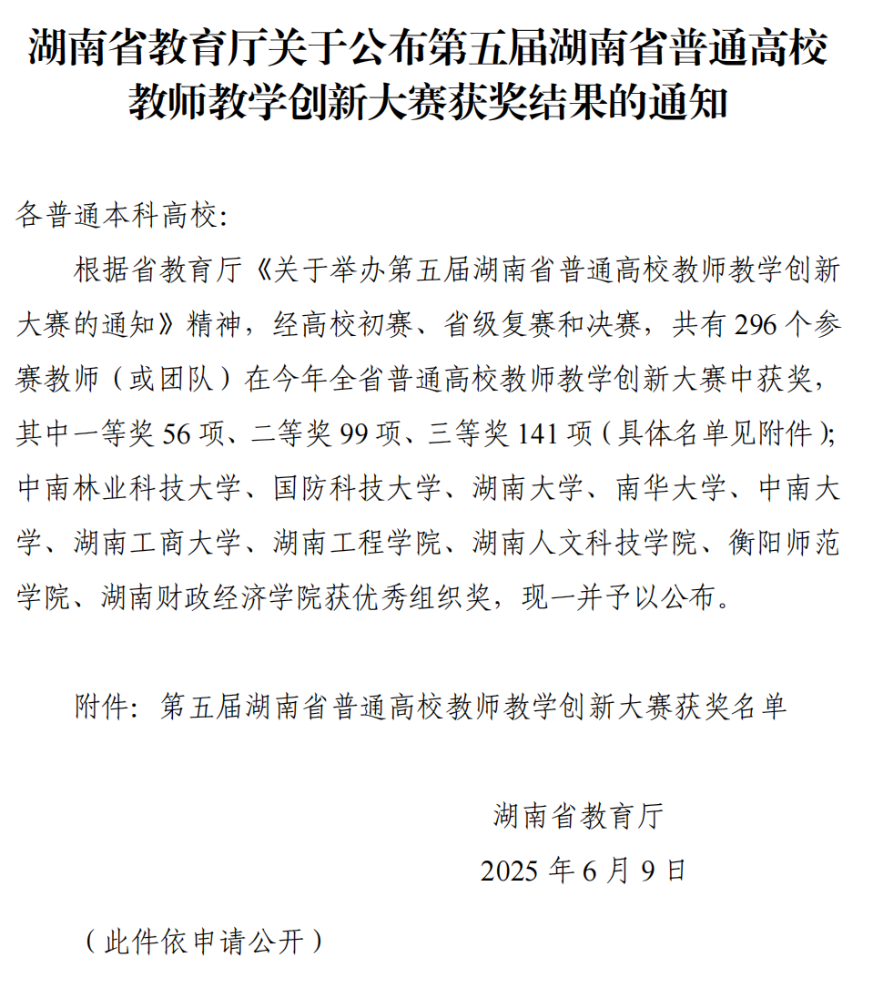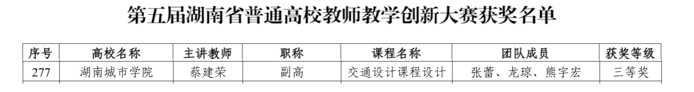 指导学生获得大学生创新创业训练计划项目国家级 1 项、省部级2项,“全国高校BIM毕业设计创新大赛”国家一等奖1项,二等奖2项,三等奖2项。专业学生获得全国大学生结构设计竞赛一等奖1项,三等奖1项。在《交通工程设计课程设计》及一系列课程教学创新改革下,考研初试上线率由之前的不足 5%上升到今年的28.2%。与益阳市交警支队打造湖南省城市道路交叉口精细化治理典型案例6个,在湖南省14个地州市中名列前茅。排查存在交通安全隐患的乡道405公里,摸排出安全隐患点段449处。