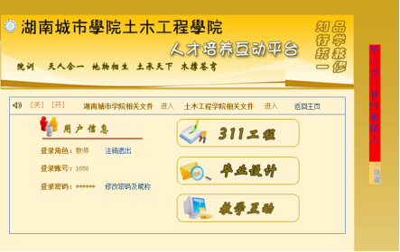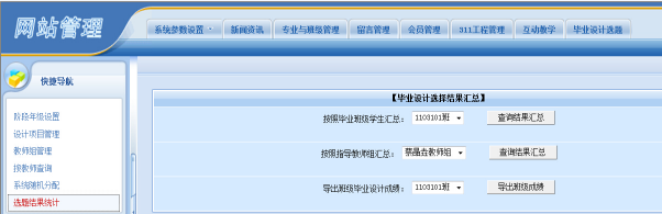 土木院土木工程专业毕业设计工作的学生选题、指导老师和学生的双向选择、阶段成绩的提交及毕业设计相关数据统计均实行网络管理。工作网络涉及学校教务处网络平台和土木院网络平台。毕业设计工作网络运行时间从毕业设计动员开始至毕业设计工作结束为止。
