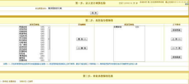 学生和指导老师关系的建立由网上双向选择确定。故设计小组与设计大组的学生并非隶属于同一个班级。毕业答辩以班级为单位进行,答辩老师小组由毕业设计答辩委员会安排确定,在一定程度上实现了交叉答辩。毕业设计成果由指导老师收集统一上交存档。指导老师对设计成果的质量和完整性负责。