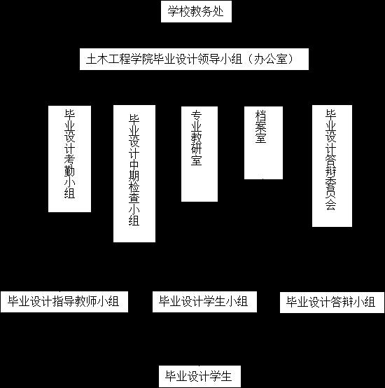 第二级为土木院毕业设计领导小组,按照教务处要求,经学院党政联系会议通过成立,设办公室(教务办兼)。主要负责核定毕业设计指导模式、设计内容、选题、教师资格、毕业设计成绩,制定毕业设计计划等,办公室全面负责毕业设计事务日常管理。