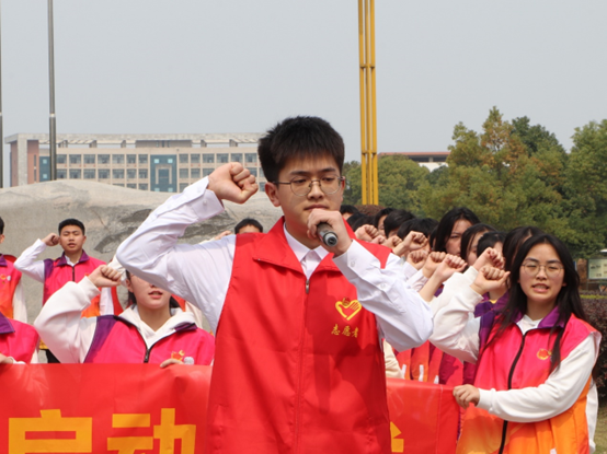 伴随着深情的诗朗诵,全场人员右手举拳,集体宣誓:“我愿意成为一名光荣的志愿者。我承诺:尽己所能,不计报酬,帮助他人,服务社会,践行志愿精神,传播先进文化,为建设团结互助、平等友爱、共同前进的美好社会贡献力量。”的志愿者誓词响彻校园。